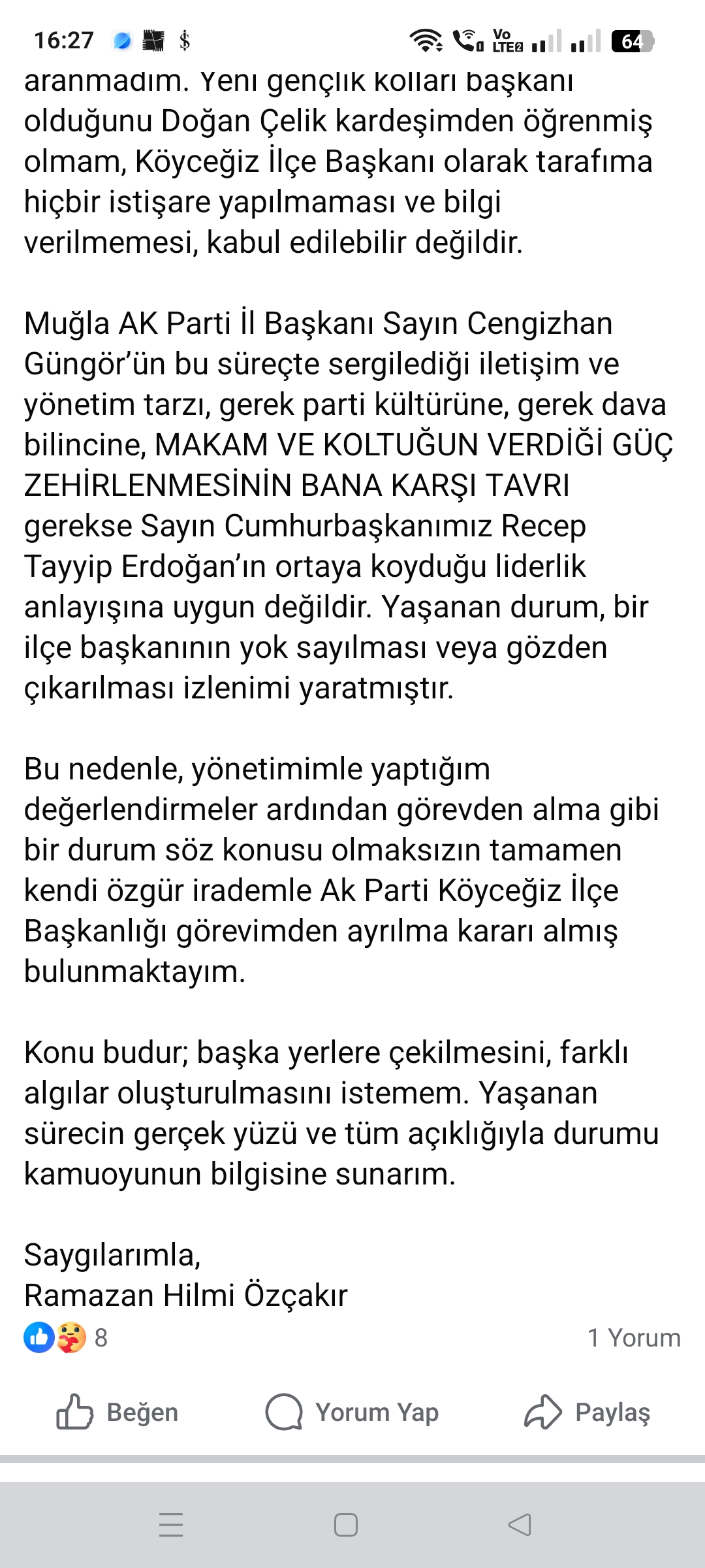 KÖYCEĞİZ AK PARTİ İLÇE BAŞKANLIĞI’DAN İSTİFA EDEN ÖZÇAKIR DAN AÇİKLAMA GELDİ